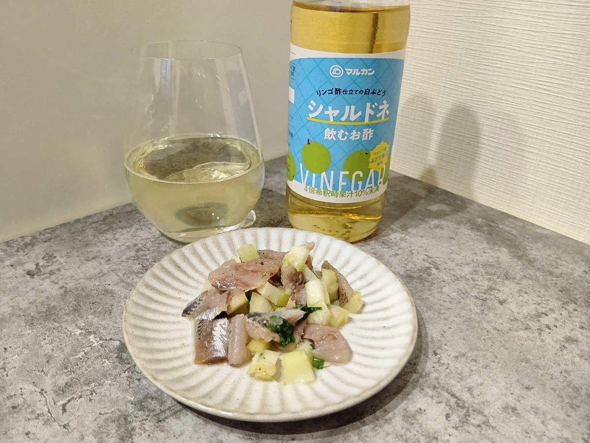 いわしの刺身、セロリ、大葉、塩こしょう、「リンゴ酢仕立ての白ぶどう シャルドネ」を20分程度マリネ。