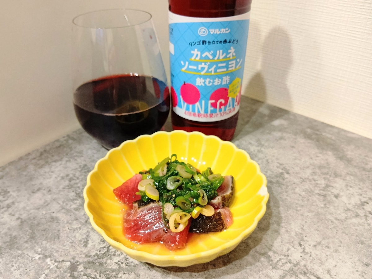 そこで、刻みネギとオリーブオイル、醤油、にんにくすりおろし、「リンゴ酢仕立ての赤ぶどう カベルネソーヴィニヨン」(大さじ1杯)をマリネ。