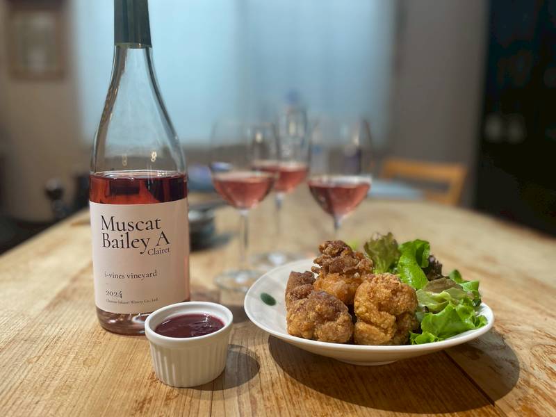 梅の酸味とマスカット・ベーリーAの甘酸っぱい味わいの調和がペアリングのポイント。さっぱりしつつ、ソースのバターの風味がほんのりと残るためリッチな印象で楽しめます。コクのあるソースと合わせることで、ワインの余韻がのびやかに。ワイン好きにはたまらない、大人のためのからあげソースです。