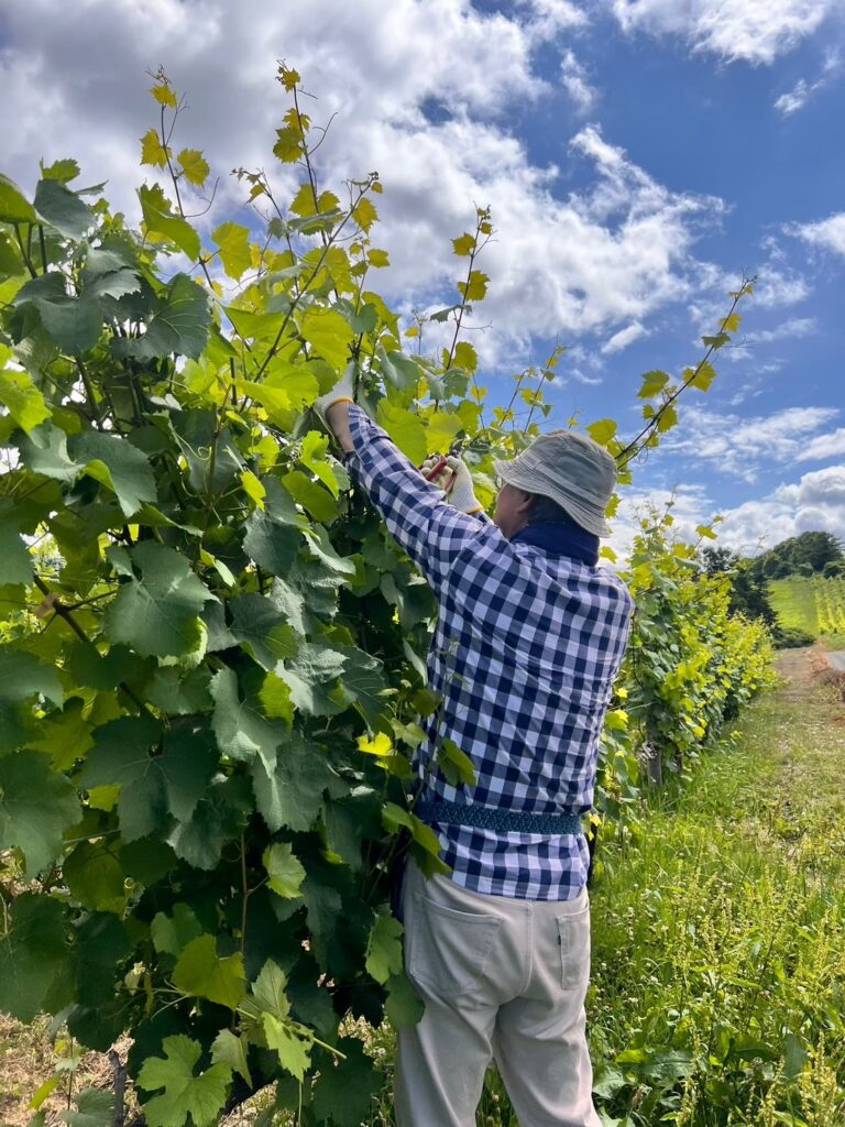 葡萄畑でもどんどん新梢も雑草も伸び、熱い日中の作業は 人にも優しくない為、休み休みの作業をしています。