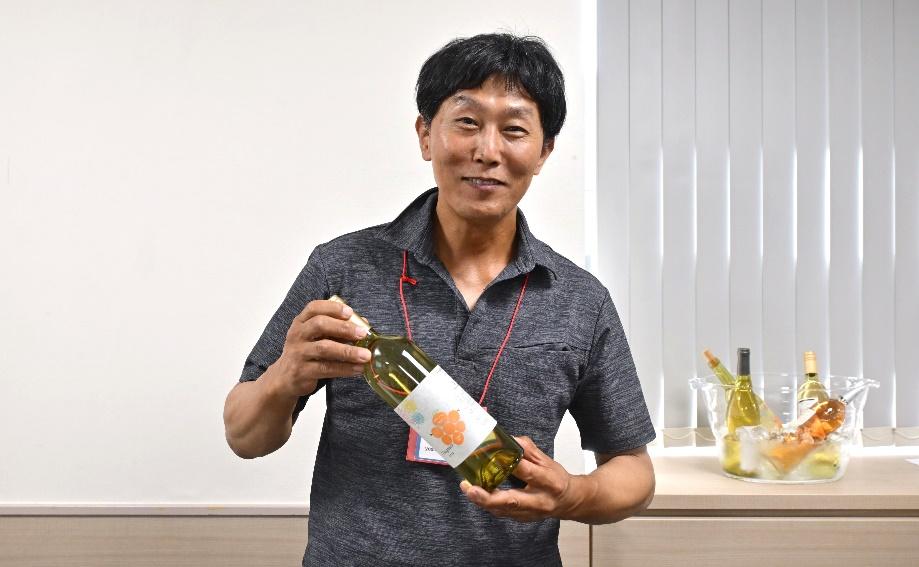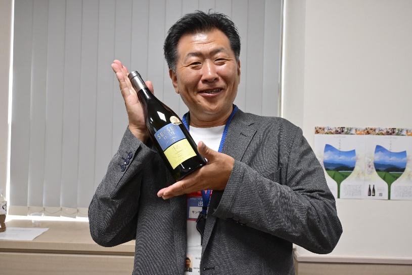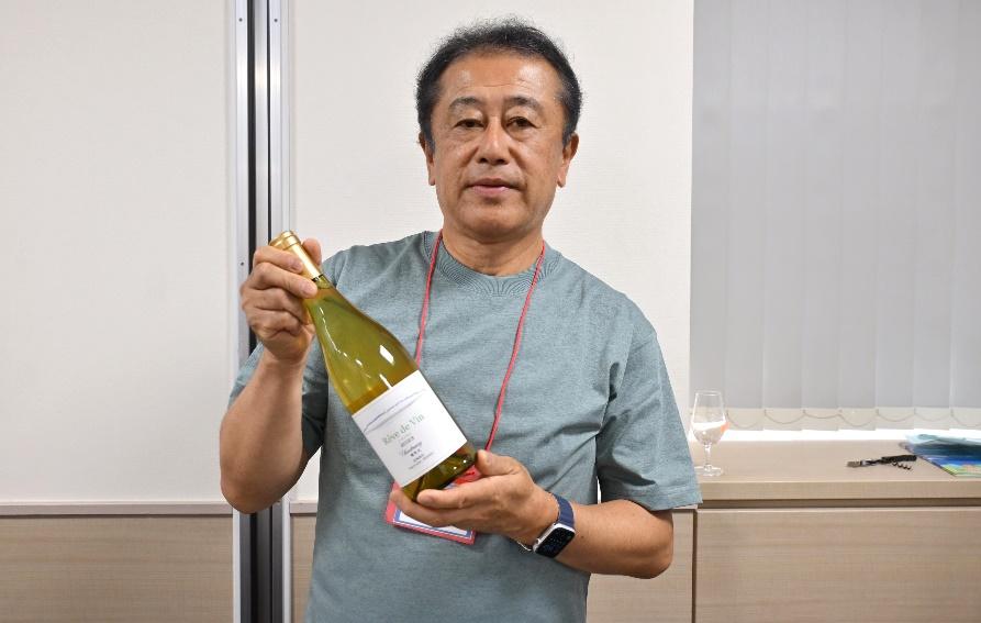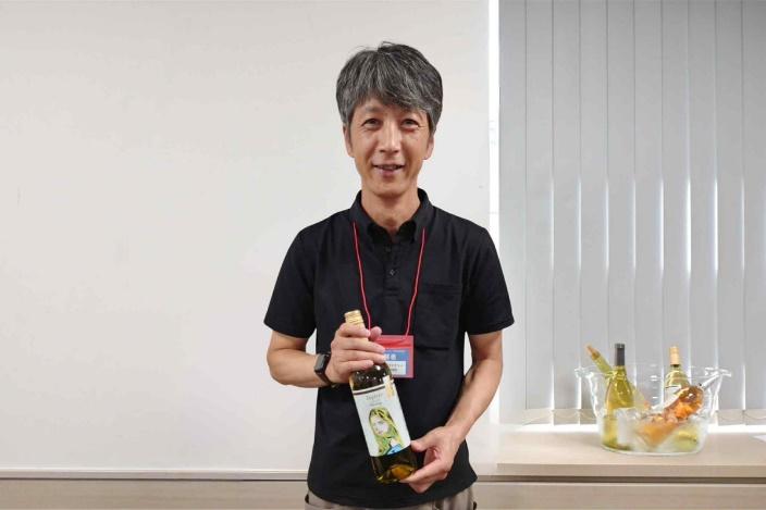 代々こだわりをもって、くだもの栽培に励んできた佐藤果樹園。ワイン造りでも、ぶどう栽培を土台に、〝ぶどう本来の香り〟を引き出すことにこだわり、「そこを100%引き出せるのが、強みかと思います」と語る生産者の佐藤さん。「今夏おすすめするのは高山村産シャルドネを使った1本です。シャルドネの香りを重視し、朝4時から7時までに収穫、9時にワイナリーに持ち込みノンストップで醸造しています。冷やした状態だと、レモン、グレープフルーツなどの爽やかな柑橘の香りを、ミネラル感と生き生きとした酸味と共に楽しめて非常にフレッシュな味わいです。ゆっくり飲んで、トロピカルな熟れたフルーツの香り、ナッツなどの香りを楽しんでいただくのも良いでしょう。幅広いシーンや料理に合わせられると思います」(佐藤さん) 「冷えた状態で試飲したのですが、ぜひナスなど合わせてみたいと思いました」(宮坂さん)