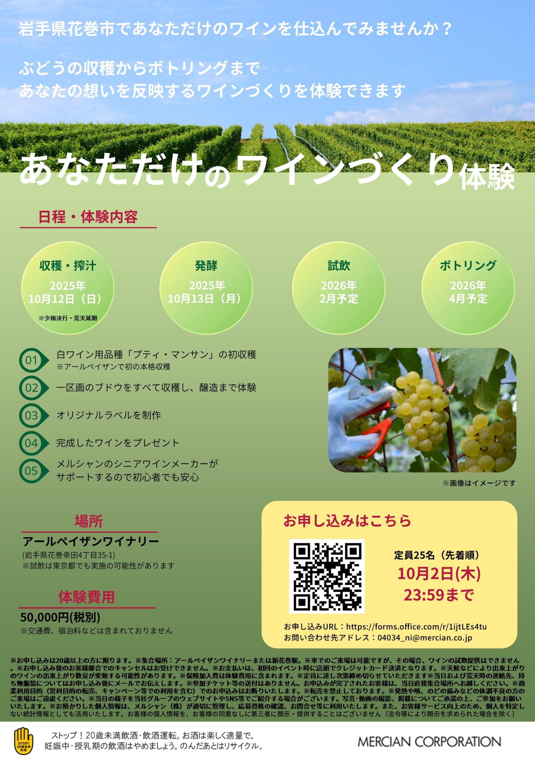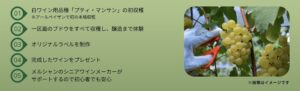 具体的には、人気の産地、岩手県花巻市にあるアールペイザンワイナリーにて、収穫からワインメイキング、オリジナルラベル作成、ボトリング、さらにはそのワインをプレゼントしてもらえる、ワインファンには貴重な機会。