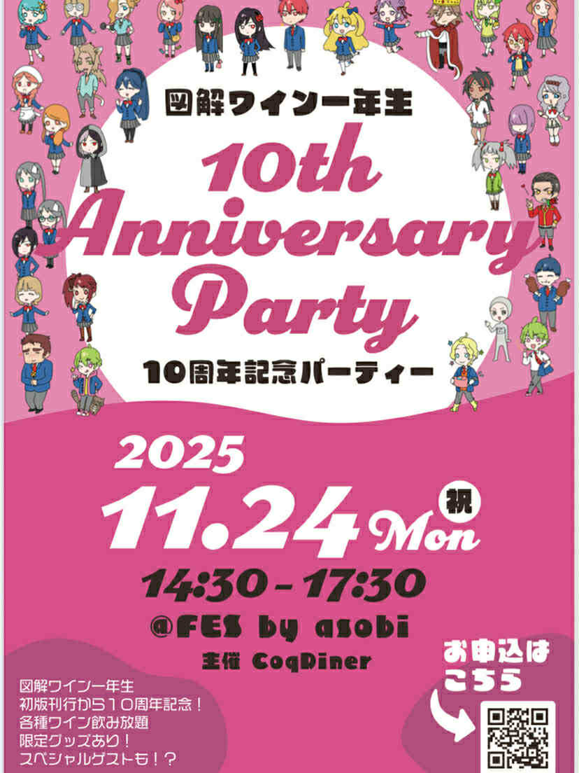 出版から10周年の今年、11月24日(月・祝日)に「図解 ワイン一年生10周年記念パーティー」 が開催されるそうです!