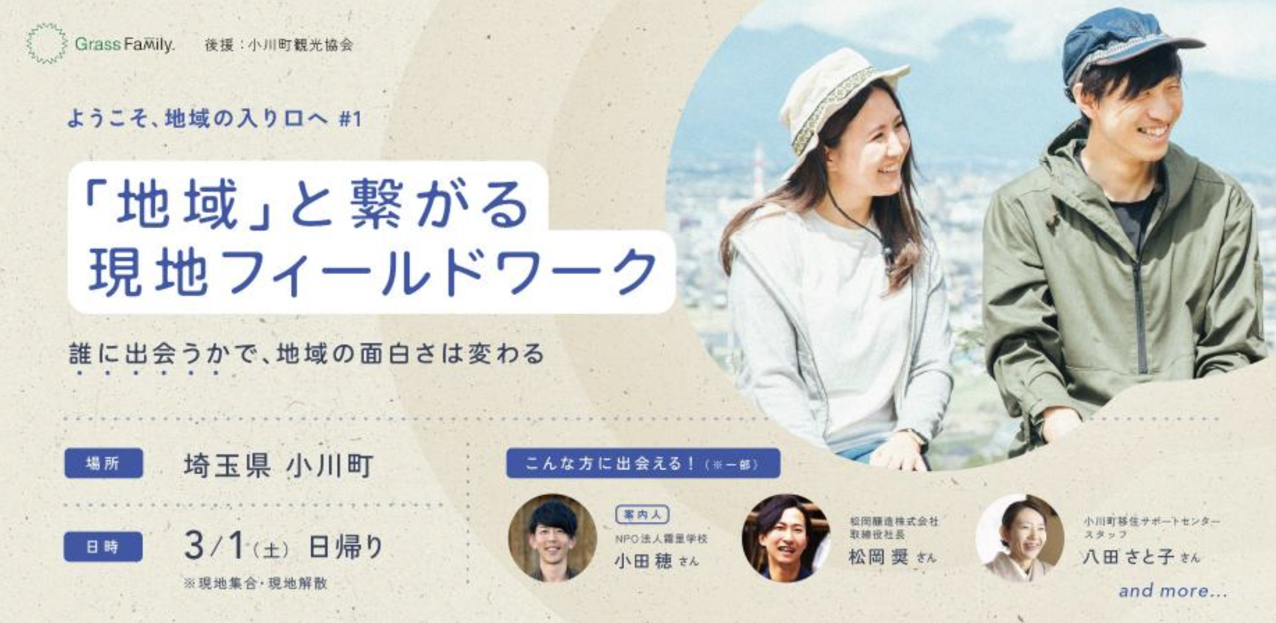 今回、埼玉県小川町でフィールドワークを開催するのは、地域と都市部」「地域と地域」を繋ぎ、関係人口・交流人口の創出に寄与する地域体験プログラム「mini Blue Project.」を展開する株式会社Grass Family.。