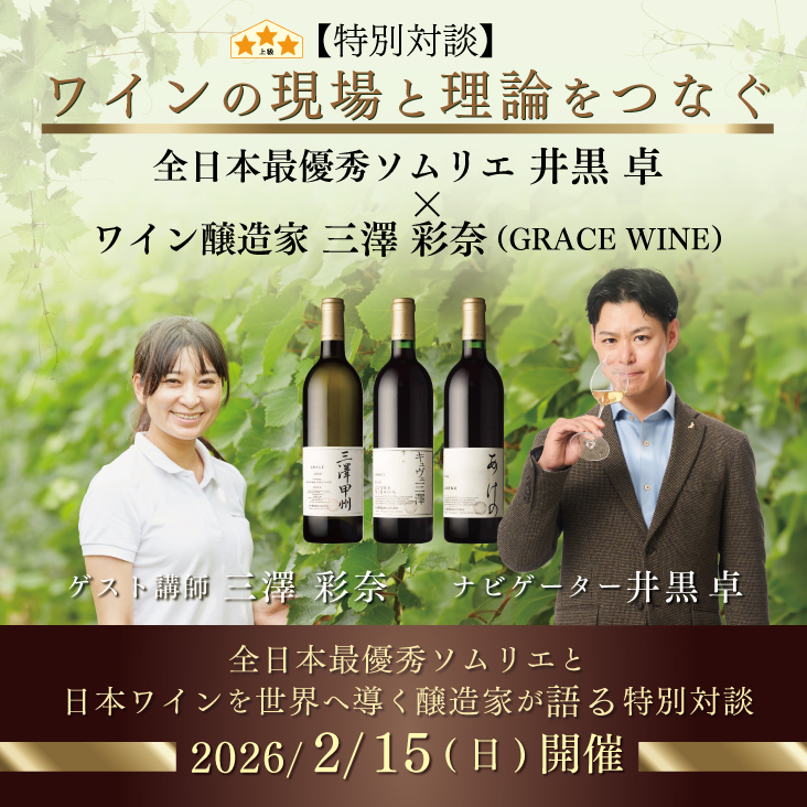 全日本最優秀ソムリエ 井黒卓氏、GRACE WINE 三澤彩奈氏が登壇する、貴重なイベントとなっています。