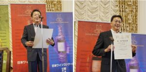 欧州・国内改良品種等ブレンド 白部門にて金・部門最高賞受賞の”Tao Caprice Blanc2024”を造る駒園ヴィンヤードの近藤修通氏は、「すべてのブドウの個性を活かしながらバランスを取ることが難しかったが、このように評価していただけ嬉しい。」とコメントされました。(写真左)