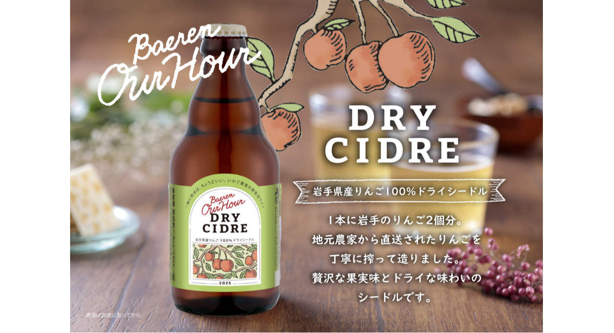 「ベアレン Our Hour ドライシードル」は、1本にりんご2個分を使用しており、贅沢な果実味とドライな味わいが特徴。