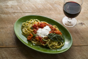 ペアリング提案されたパスタは、リコッタのコク、トマトの酸味、バジルの爽やかさのバランスが良い一皿。ワインが重すぎず、チャーミングなベリー香は、バジルの爽やかさとよく合います。