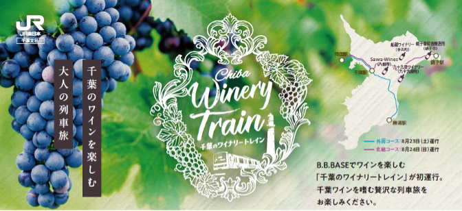 JR千葉支社では、千葉県内に所在する4つのワイナリー『Sawa Wines(八街市)』『九十九里ワイナリー(九十九里町)』『船越ワイナリー(多古町)』『銚子葡萄酒醸造所(銚子市)』と連携し、地元ワインを楽しみながら、千葉を旅する「千葉のワイナリートレイン」を初運行。